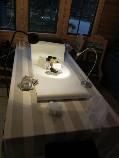 Så setter jeg lys. Da bruker jeg små lamper fra flere kanter. På disse bildene har jeg både dagslys, taklys og to lamper. Så flytter jeg på de små lampene til jeg får skyggene dit jeg vil ha de.