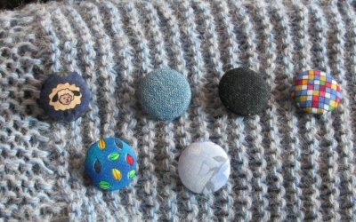 Da jeg var ferdig å strikke skulle jeg velge knapper. Egentlig hadde jeg laget, spesielt for genseren, de som er nederst til høyre. Men – da genseren var ferdig var det de lyse dongeriknappene som ropte ut at de ville bli brukt. Og det ble helt rett.
