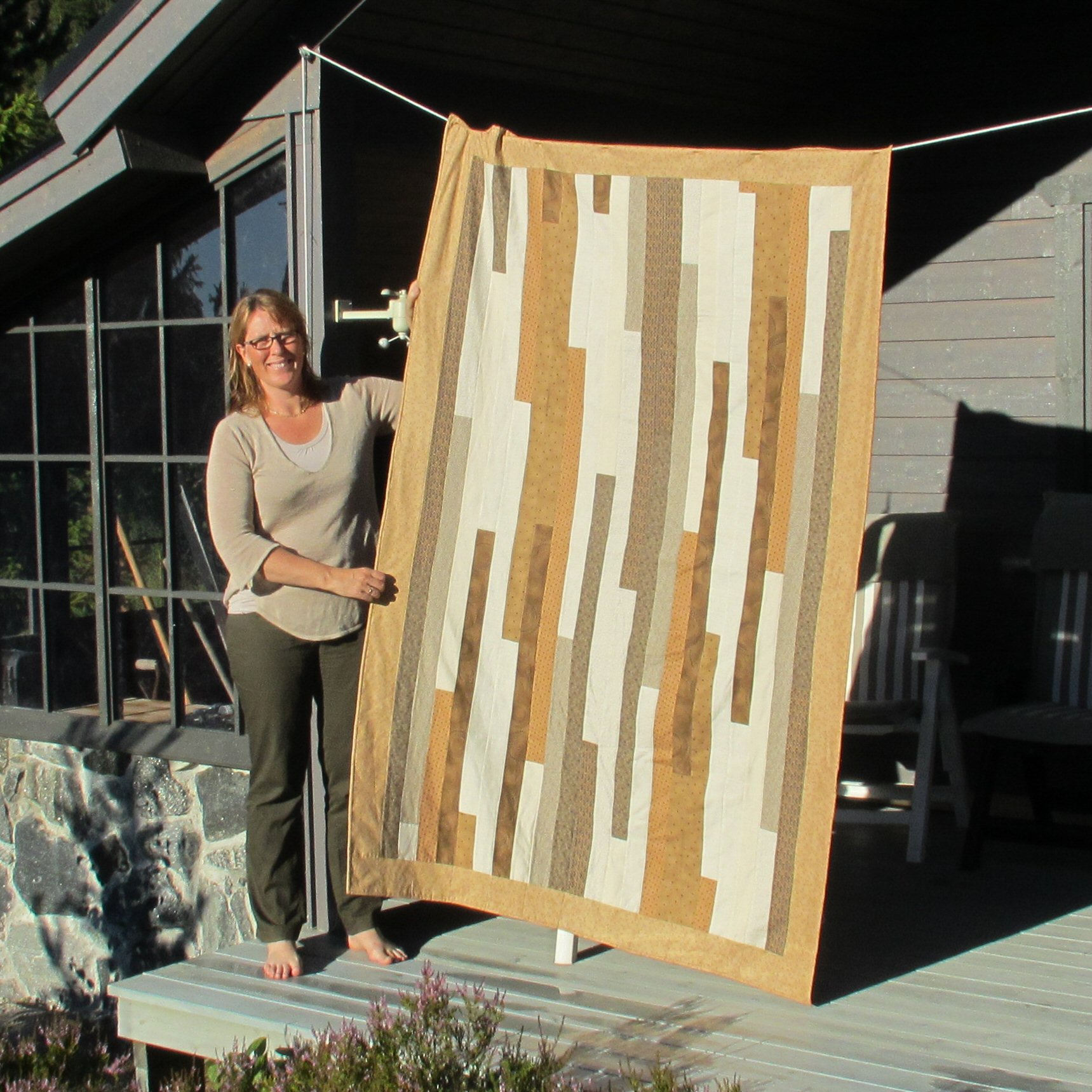 Det hadde seg nemlig slik at for ett år siden kjøpte jeg inn mengder med stoff som jeg hadde planer for – er det ikke ofte slik? Så holder vi på med oppussing hjemme og syrommet mitt var ikke klart før ved juletider, og da var dette helt glemt. Så i den (stadig) pågående ryddingen av syrommet mitt dukket det opp to store bæreposer, en stappfull av to fleecestoff som jeg hadde tenkt som bakstykker, og en som var stappfull av mange meter med lekre brune og beige quiltestoffer!