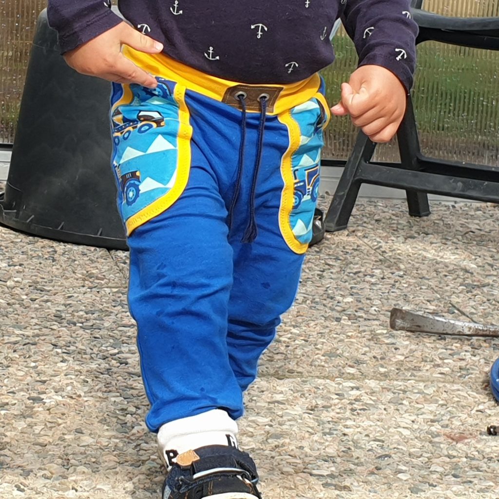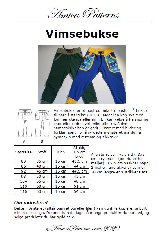 Jeg har laget et nytt mønster – nemlig Vimsebukse! Det er et fleksibelt mønster, du velger selv om du vil ha lommer utenpå eller inni (kan også droppes), i linningen er det ribb, du kan i tillegg ha strikk og anorakksnor – her også velger du det som passer best.