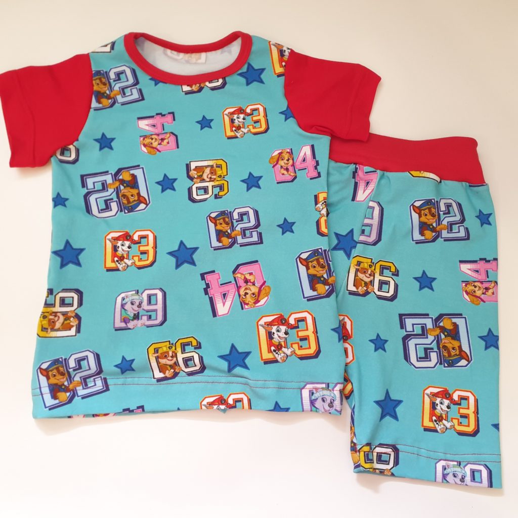 T-skjorten er sydd etter mønsteret “En helt enkel genser”, hvor ermelengden bare er kortet ned, og buksen er en variant av et basismønster jeg holder på med – så mer om det kommer senere 🙂